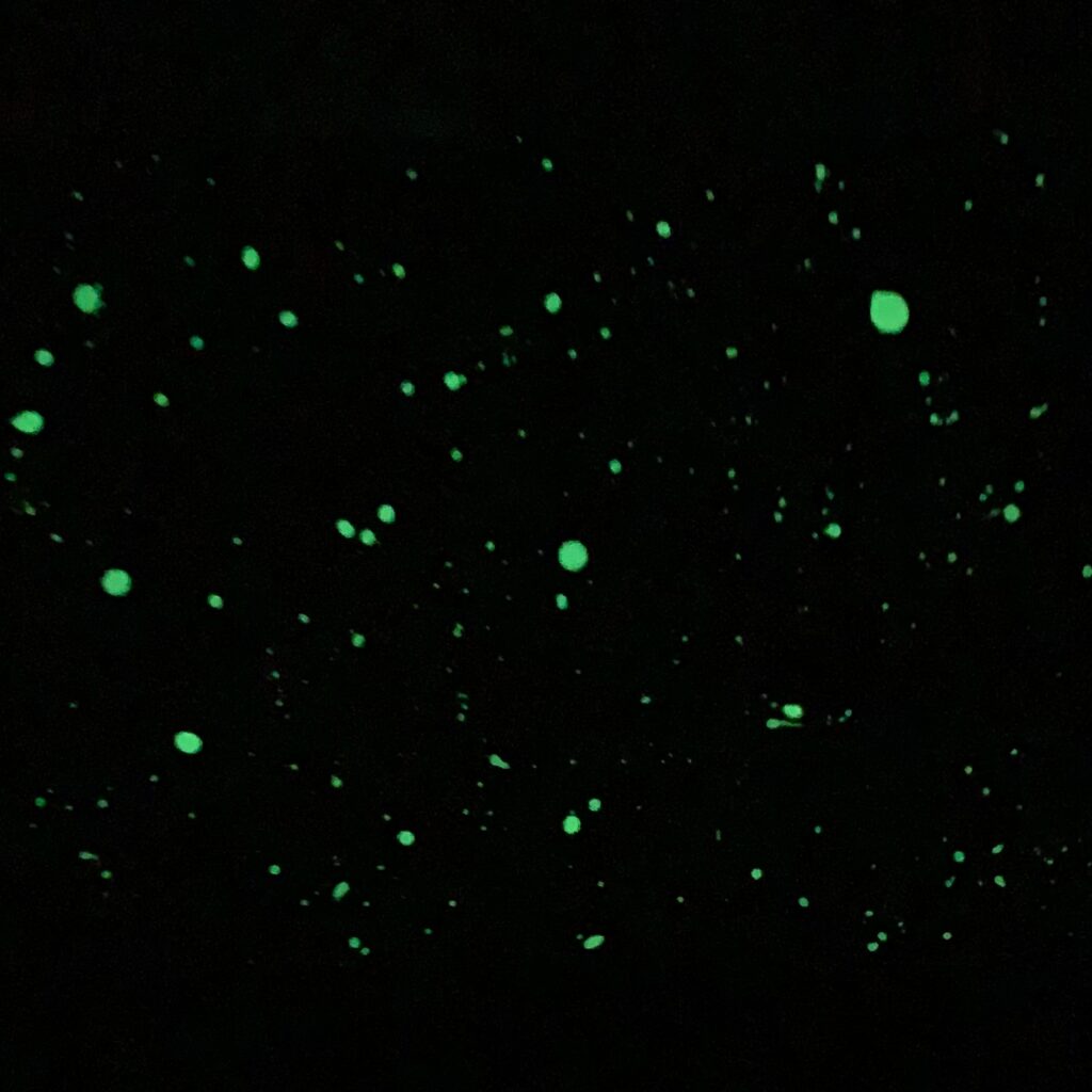 GLOW – Acrylic, glitter, phosphorus, spray on canvas / 50x50x2cm – AVAILABLE
