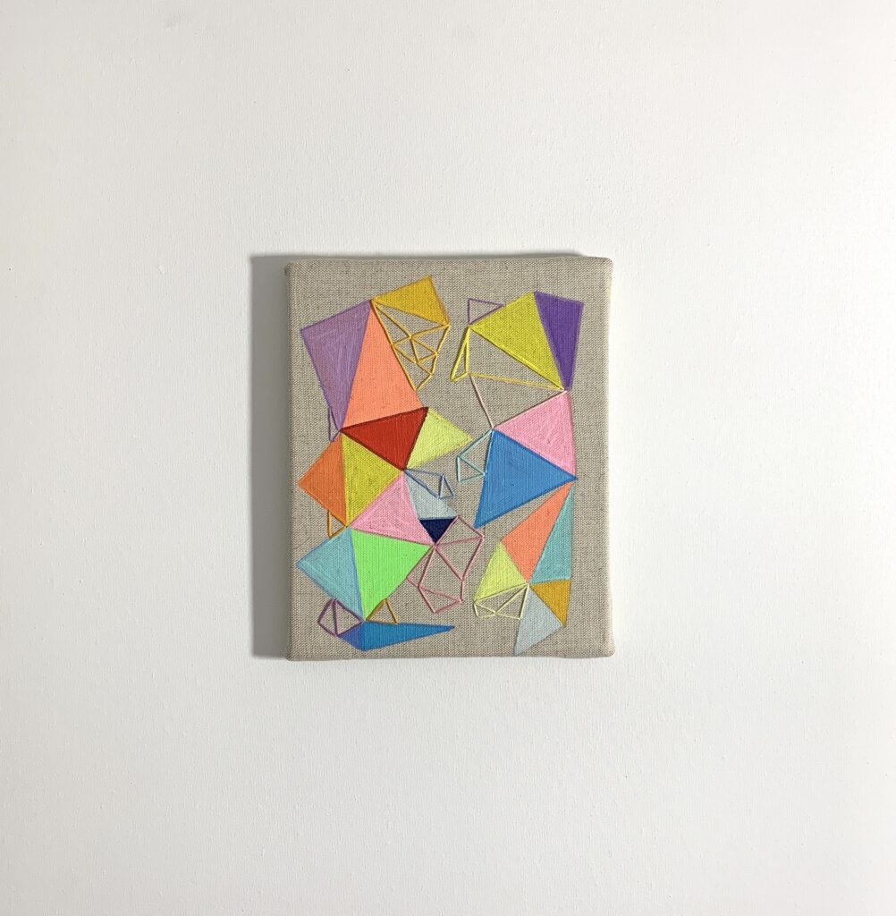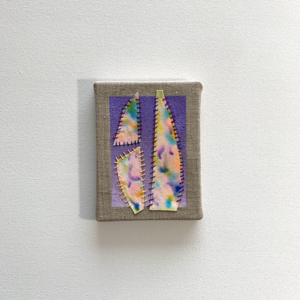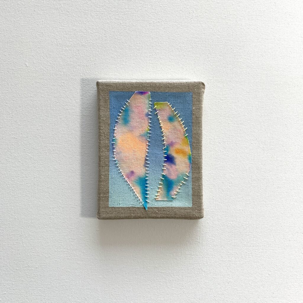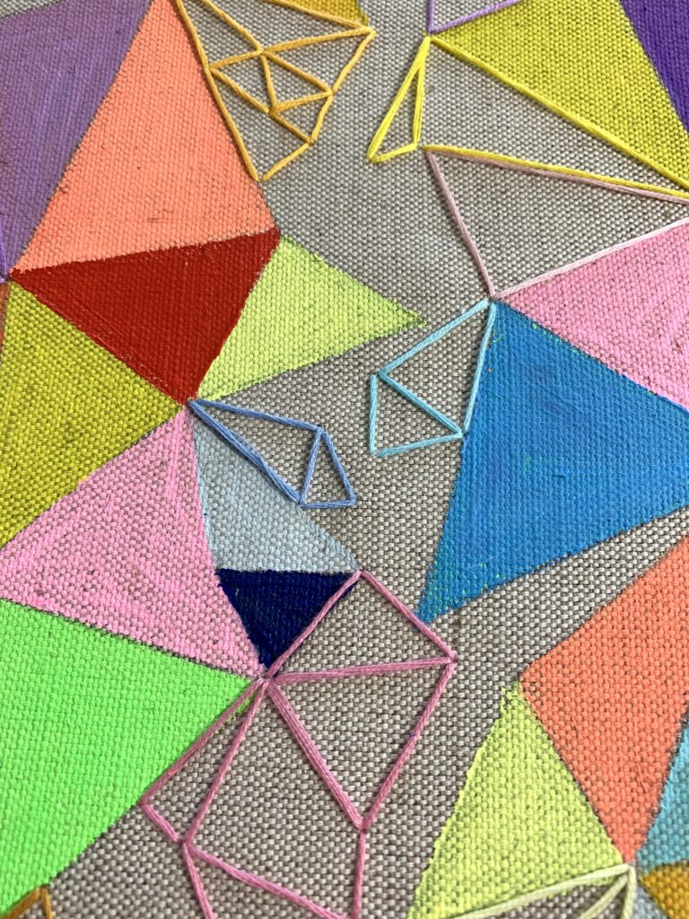 Having embroidery in painting comes from my handmade skills, from fashion. I can sew, embroider, knit, crochet hats, sweaters since I was a child, for myself, for dolls, with my grandmother at her friend’s dressmaker, whom we used to go to. Therefore, embroidery transferred to paintings, today’s time, contemporary modern language.