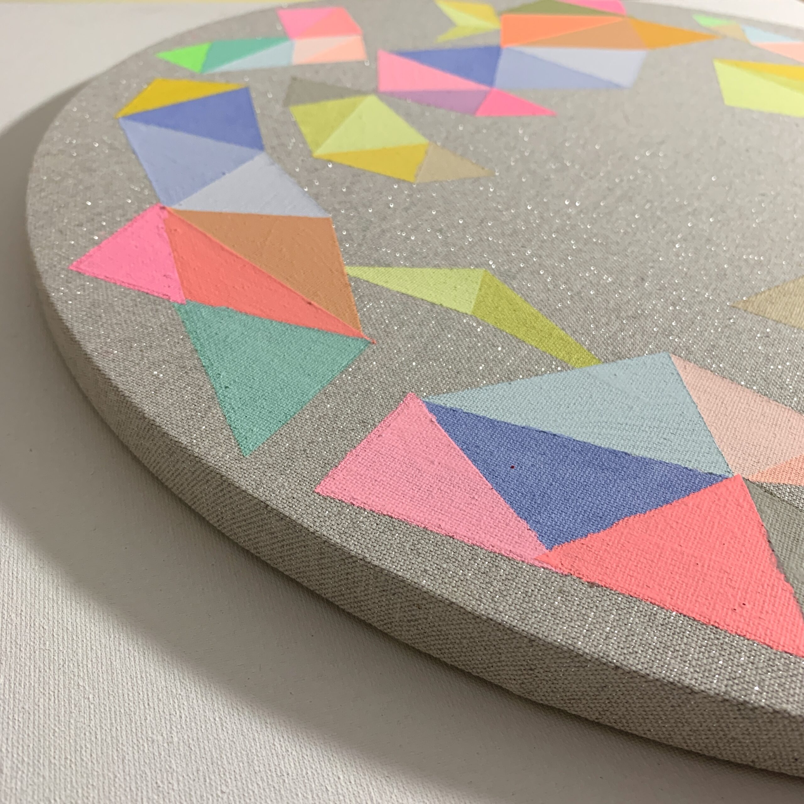Color geometry, painting colored triangles. I had to first match the colors by painting on a tablet so that I knew in advance what colors would match the color of the canvas. It was challenging, lengthy, but it is also a nice meditation for peace and an opportunity to learn how to mix colors. Acrylic on silver glittering canvas. Dimensions, year: 50x2cm/2025