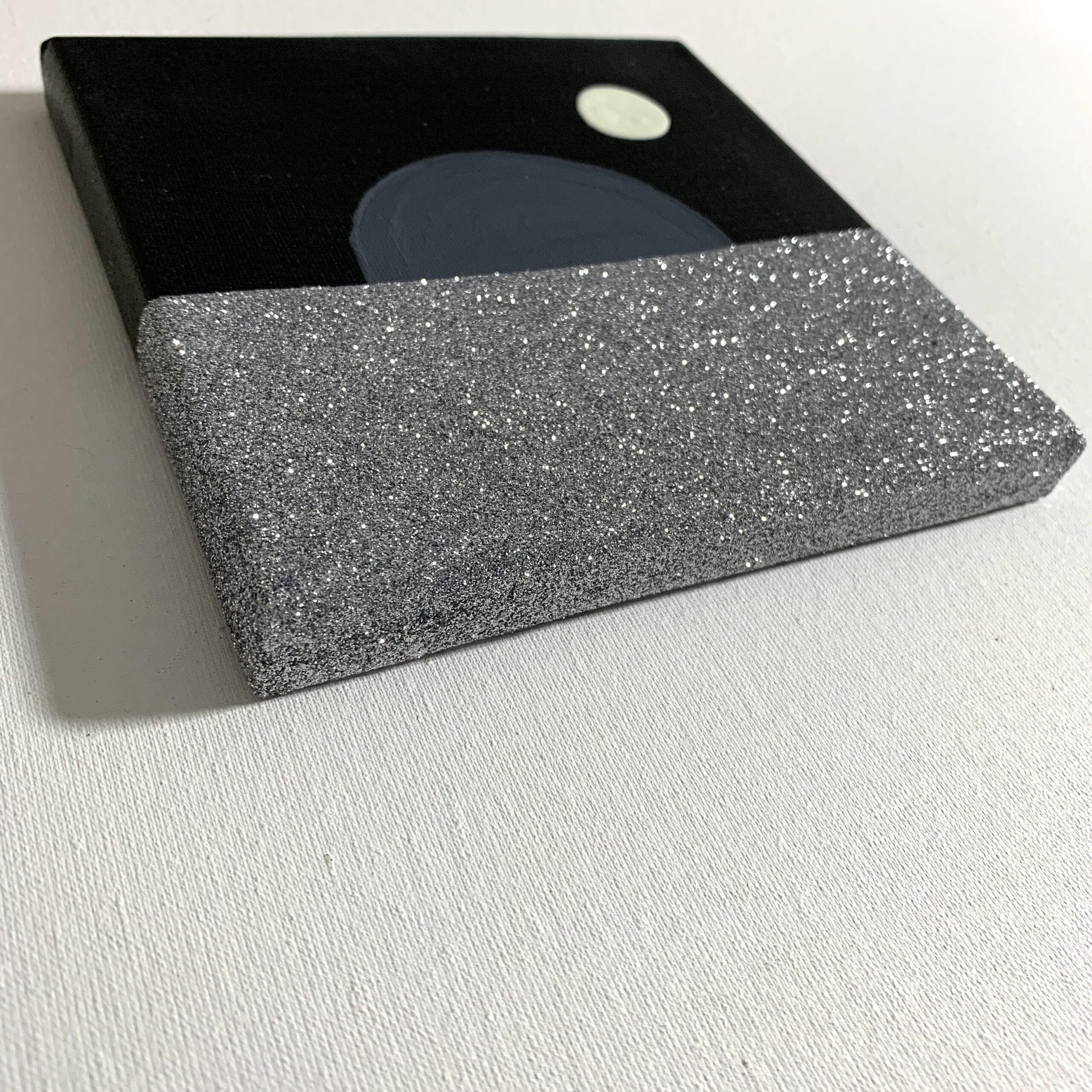 Monochromatická, akrylová plochosť farieb, dekorovaná, glitrrami a fosforom. Svieti v tme. Rozmery, rok: 15x1x15cm, 2024